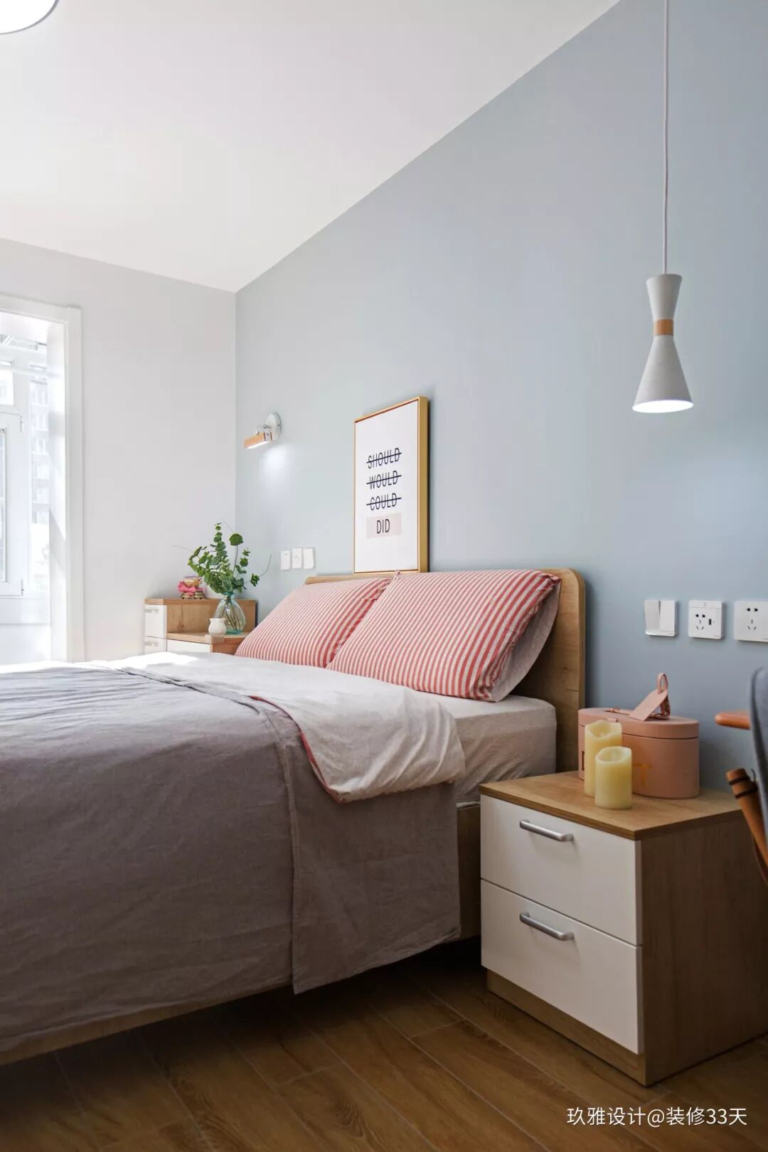 ▲ 主卧,木色家具搭配灰蓝色背景墙,两侧点缀不同造型灯饰