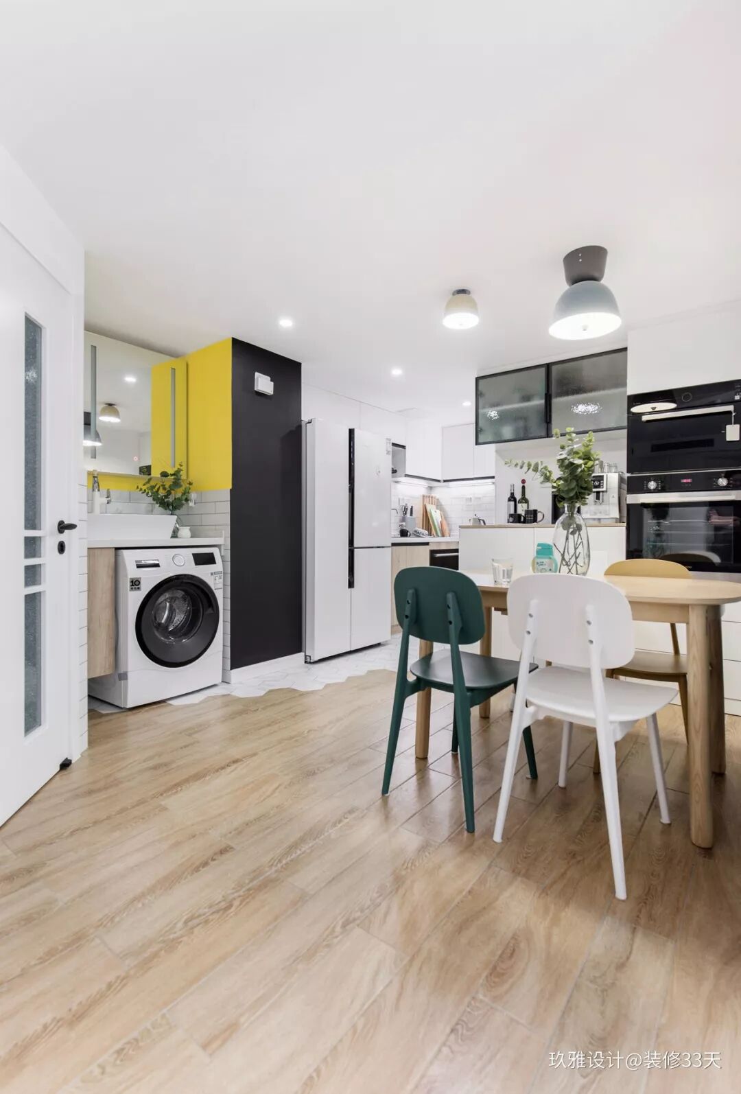 ▲ 餐厅,折叠餐桌椅靠墙放置,留出宽敞过道,边上设计储物柜与水吧台