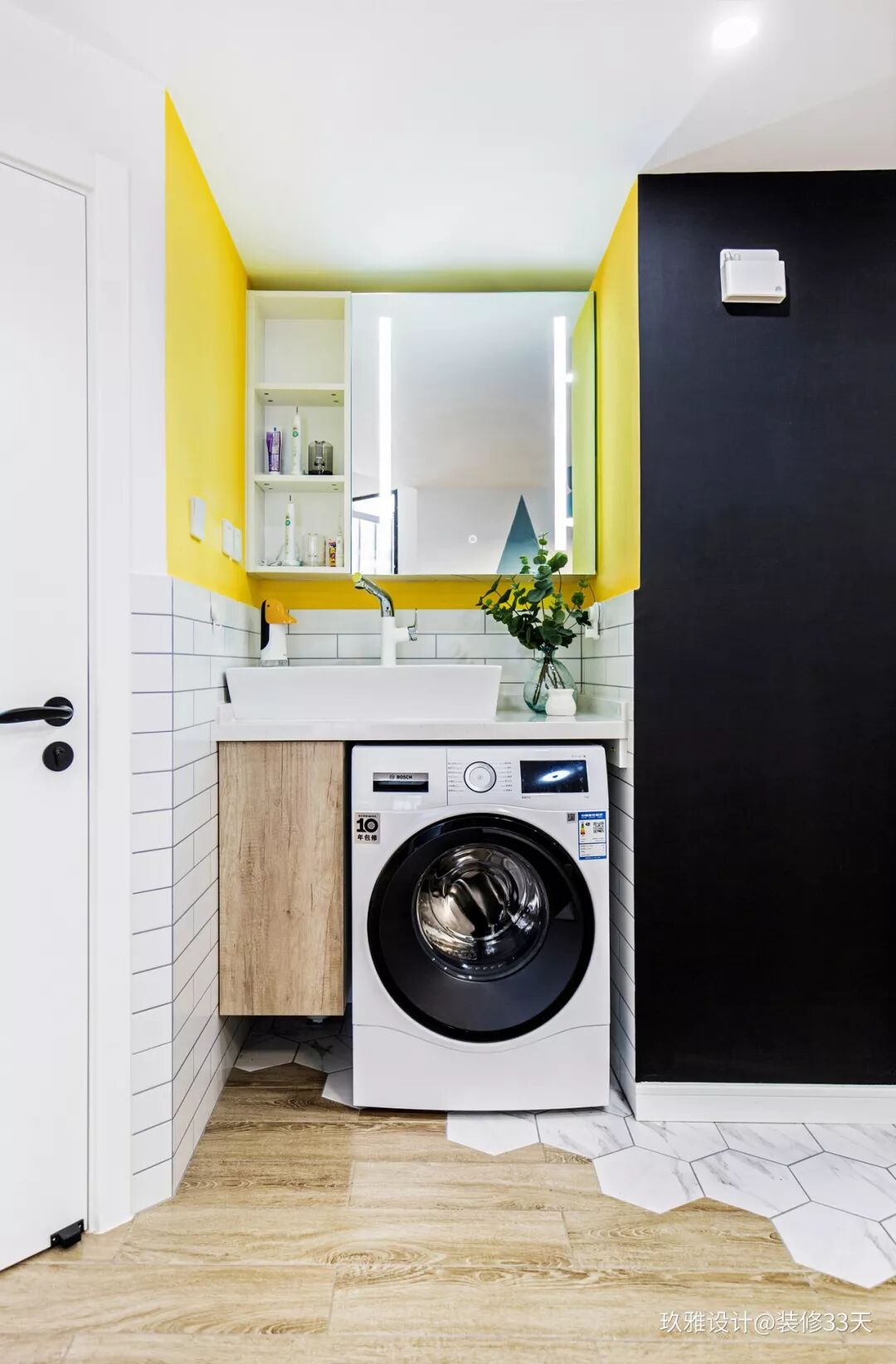 ▲ 卫生间,干湿分区,右侧烟道涂上黑板漆,方便宝宝涂鸦玩耍,明黄色背景墙活跃空间