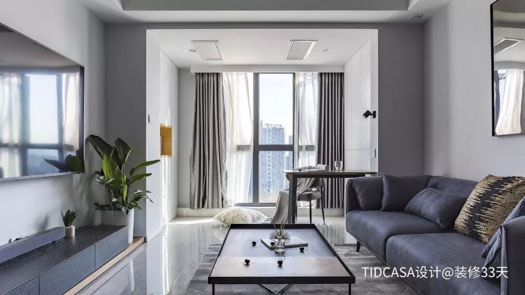 ▲ 客厅浅灰色瓷砖地面加铺灰色地毯,地面与墙面保持色调一致,顶面设计采用点光源局部照明,简洁干练