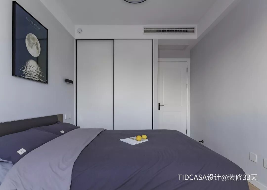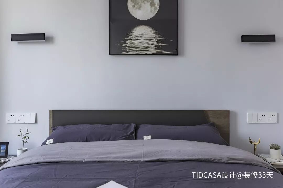 ▲ 次卧,灰色墙面装饰深色壁灯与意境简框画修饰床背景,做工细致的大床搭配灰紫色床品,打造舒适的就寝环境