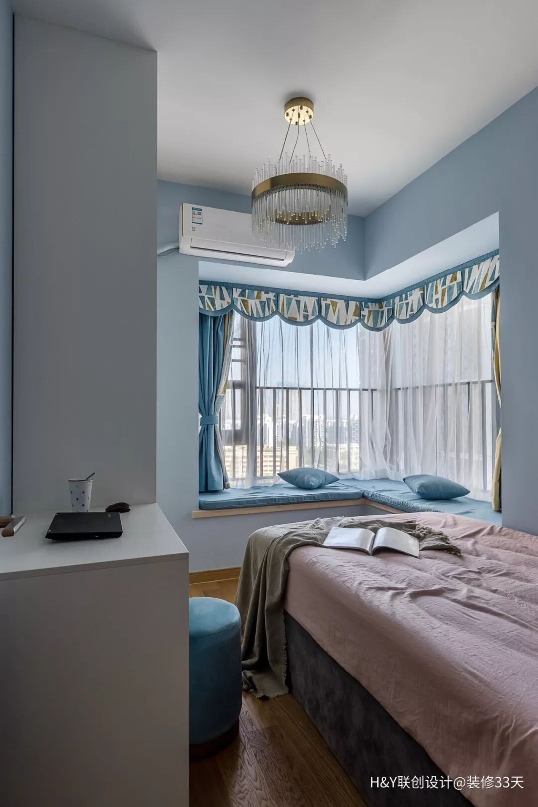 ▲ 整个空间的色调也是以灰蓝色为主,清新淡雅,L型飘窗成为空间休闲一角