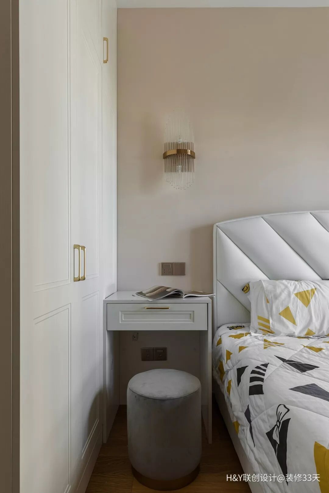 ▲ 长辈房,满足父母每年过来小住上一两个月的需求,墙面颜色以浅杏色为主,温馨宁静,搭配几何图案的床品使整个空间配色呼应