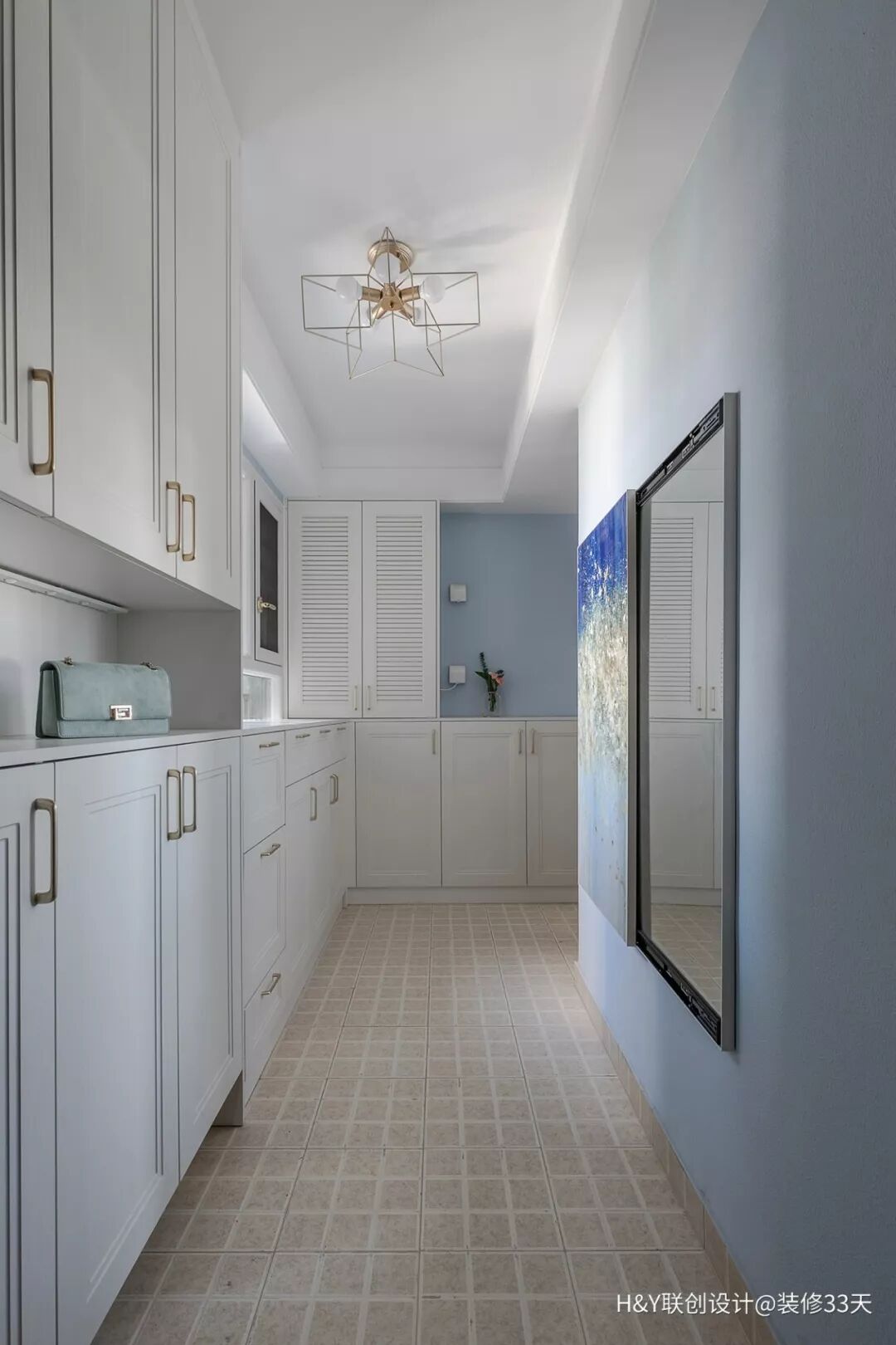 ▲ 入户,大面积的储物柜作端景,可收纳四季鞋子,还可兼顾其他物品的收纳,右侧墙面用装饰画隐藏穿衣镜