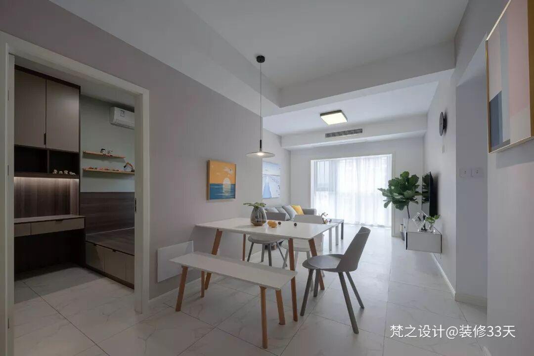 ▲ 餐厅,北欧风餐桌椅搭配长凳,可同时容纳多人就餐,灰色系背景墙点缀多彩装饰画