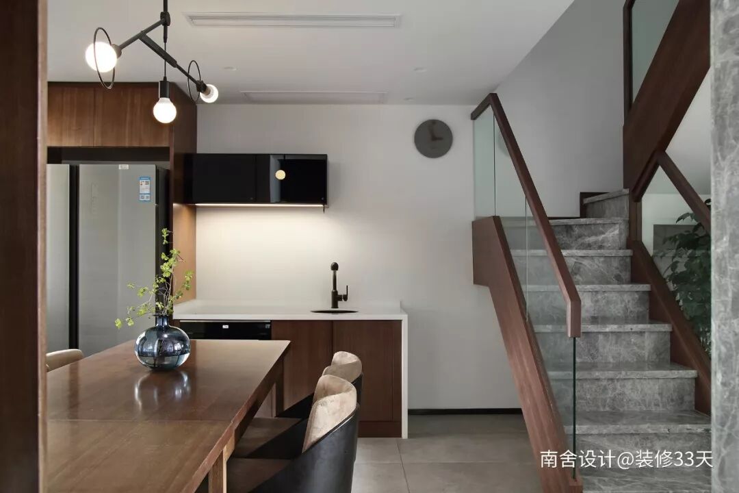 ▲ 采用长虹玻璃门隔断厨房空间,楼梯设计玻璃扶手