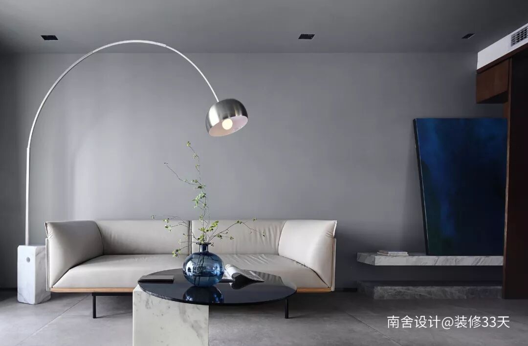 ▲ 客厅整体以灰色为主,选用浅色皮沙发与大理石茶几,搭配一盏现代钓鱼灯