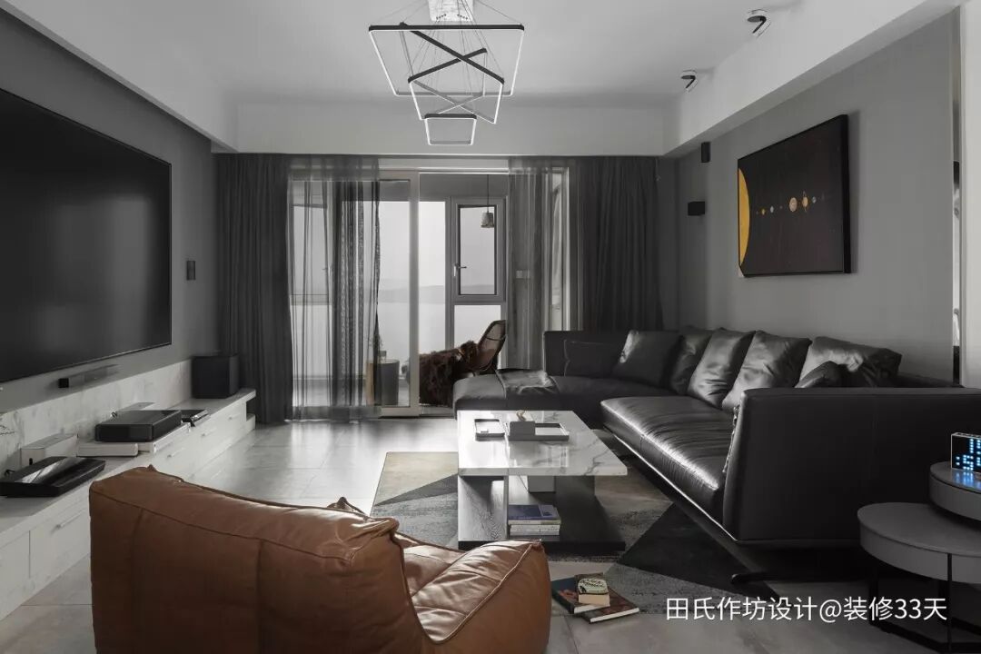 ▲ 客厅,黑白灰三色空间,无过多修饰,极简顶面点缀一盏线条感吊灯