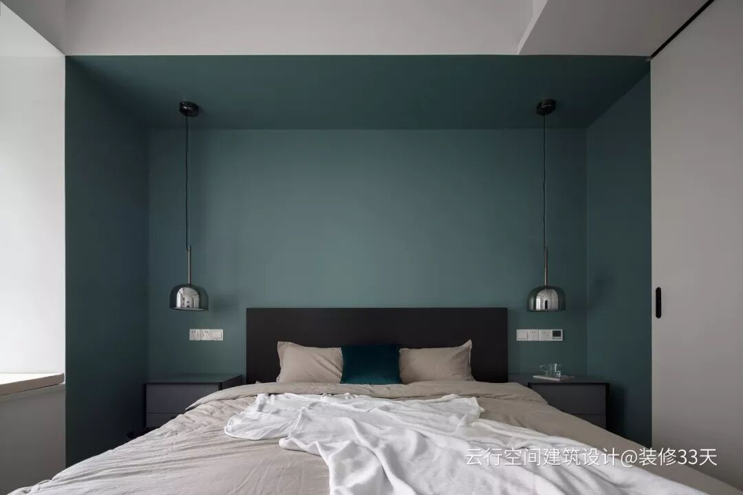 ▲ 考虑主卧的顶面结构,采用前面与顶面乳胶漆分色处理,让整体的空间感更方正