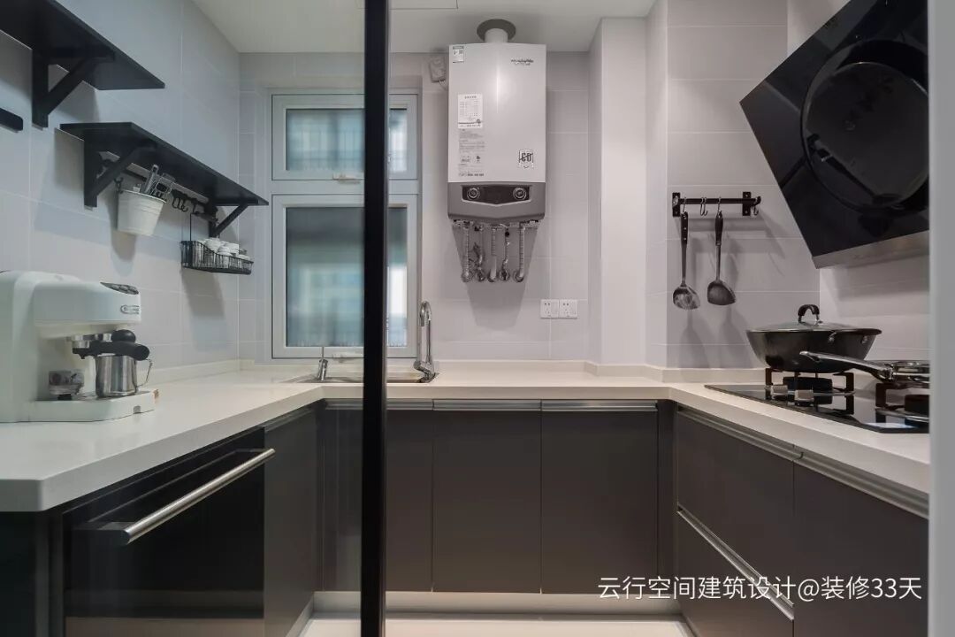▲ 厨房,墙地通铺同色系瓷砖,布置U型橱柜,最大化利用空间,取消常规吊柜让空间更加开阔轻盈