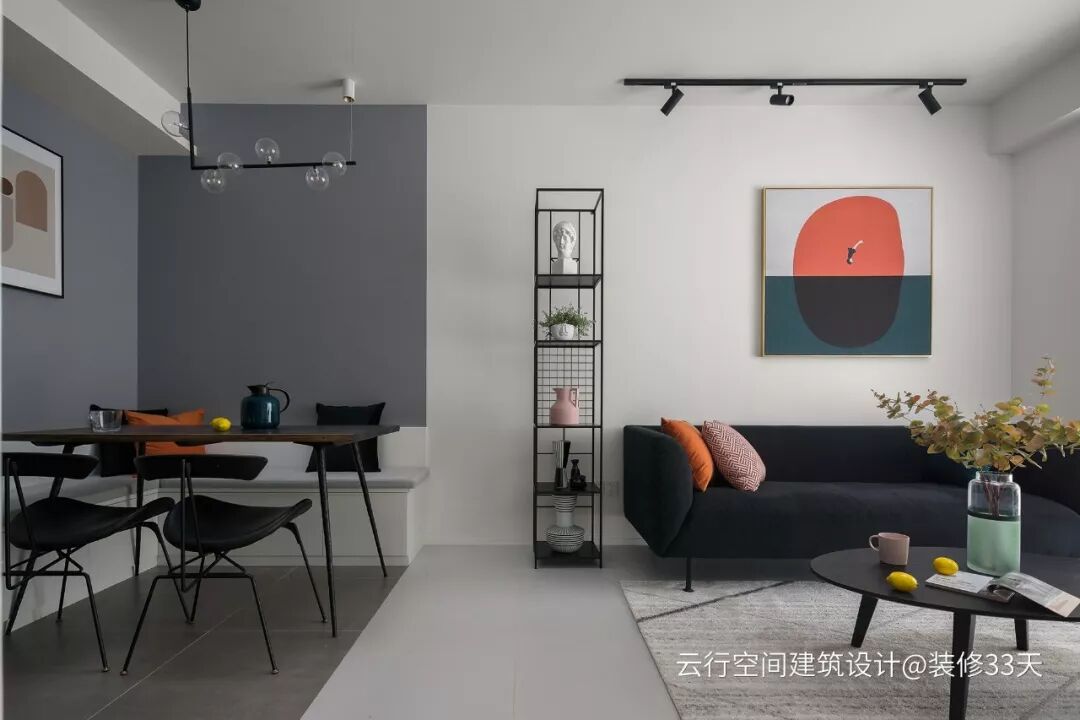 ▲ 灰色乳胶漆墙面挂莫兰迪色系简框画,与细脚铁件家具勾勒简洁空间