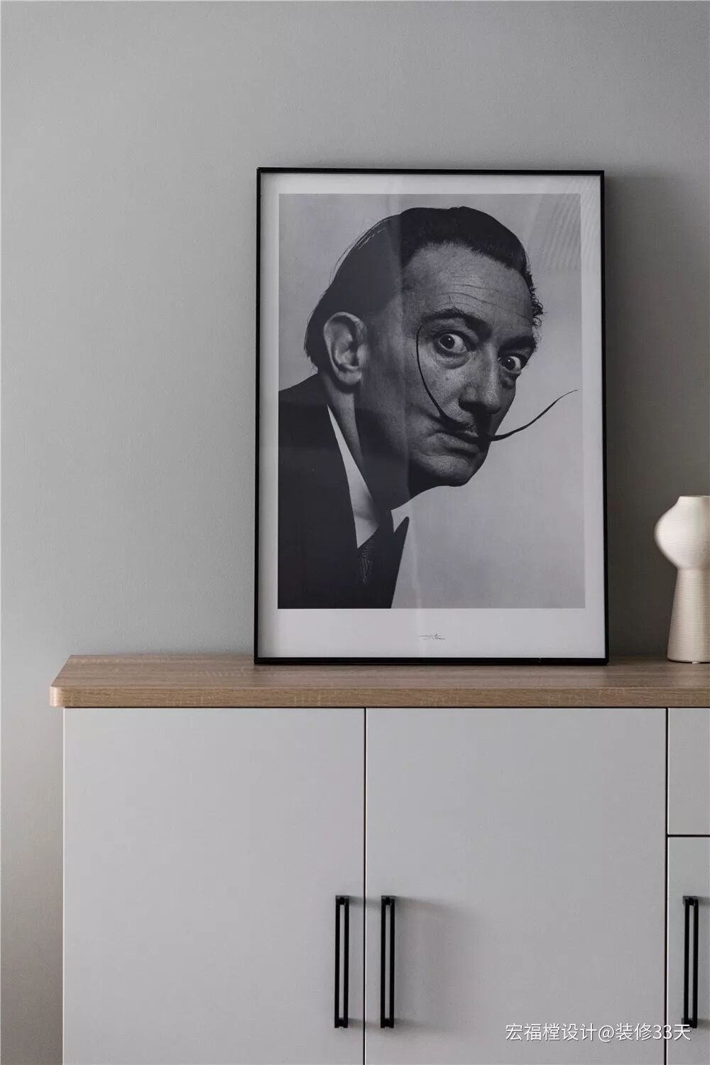 ▲ 客餐厅走廊端景,成品矮柜增添公领域收纳空间,一幅达利肖像画点缀
