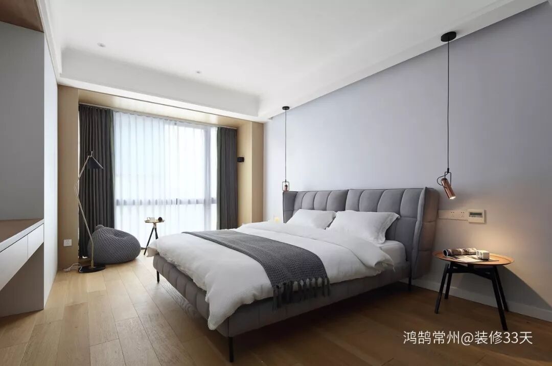 ▲ 在灰色+木色的空间中,搭配白色床品,在灯光与香薰蜡烛的映衬下更加温馨