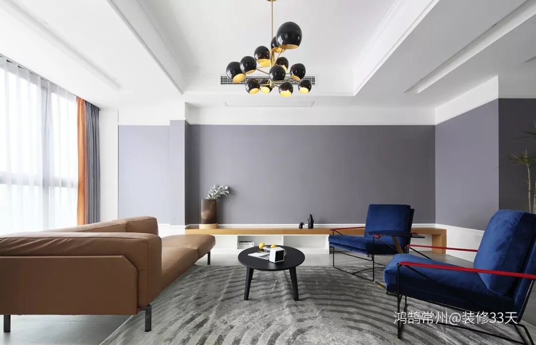 ▲ 客厅,浅灰色地砖搭配银灰色圆形图案的地毯,灰紫色的墙面漆通过上下留白,咖棕色主沙发搭配黑色小茶几与吊灯