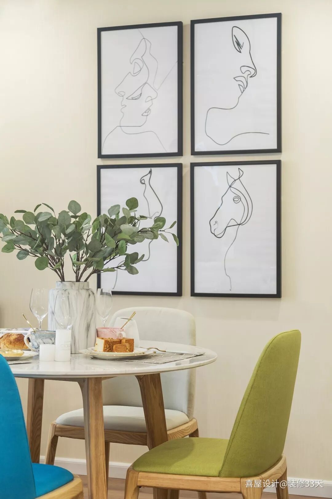 ▲ 圆餐桌是种趣致的态度,不仅节约了空间又使整体柔和起来,不同色调的餐椅与墙面素描简框画,整体搭配又似彩虹色里的宁静