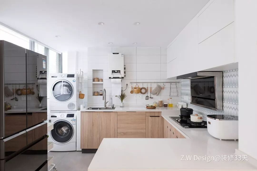 ▲ 将原始生活阳台与厨房合为一体后设计为开放式厨房,在角落预留了洗衣机与烘干机的位置