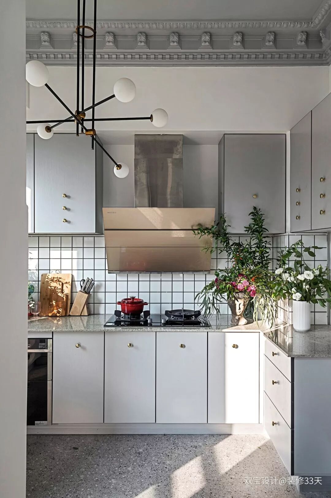 ▲ 在常规厨房顶上预埋烟道线管的区域(大概从顶吊下来400mm),全部做在吊柜以上的区域(如图吊柜以上的白色区域),保留层高又未占任何储物功能,色彩上保留墙面的白色,将顶面做漆,增加空间的精致感及耐脏性