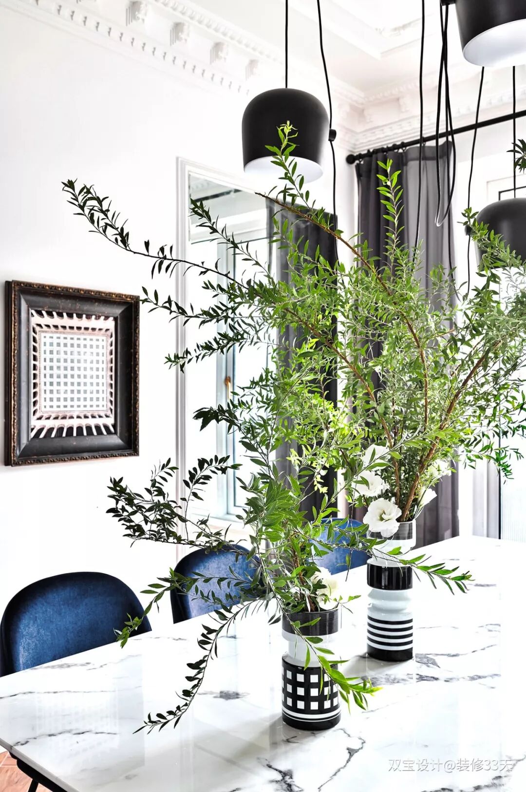 ▲ 纤薄的石材餐桌,蓝丝绒餐椅,金属元素桌脚,每个软装细节透露着优雅气质