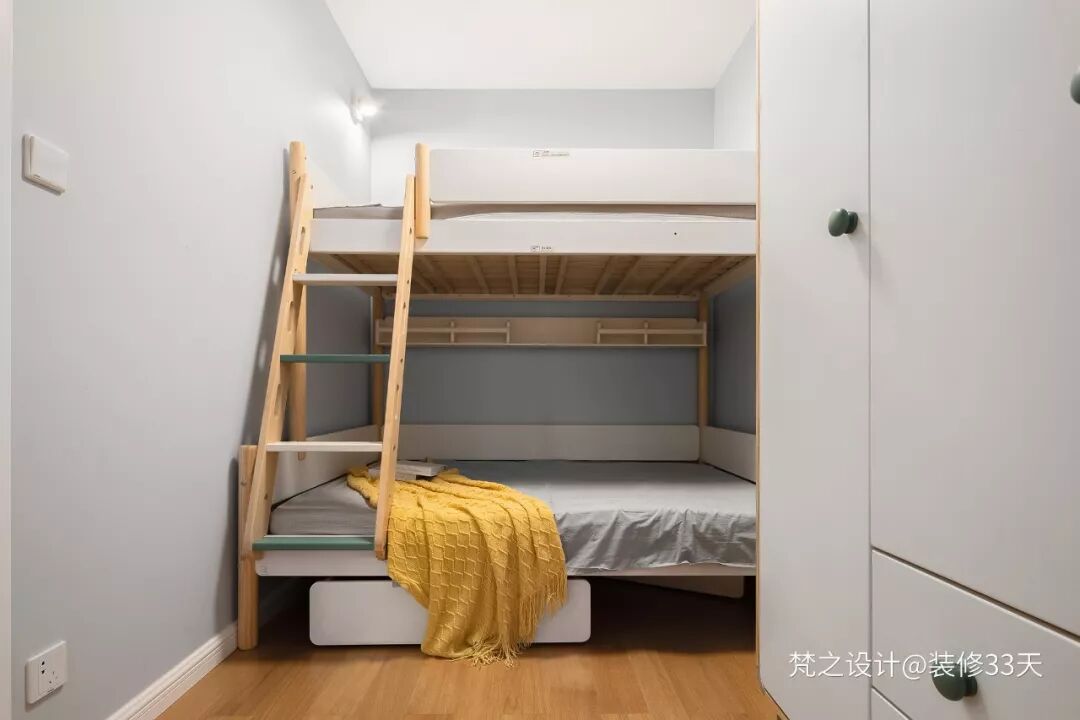 ▲ 儿童房以原木色+白色家具为基调,辅以墙面、窗帘、床品颜色呼应,床下的收纳柜低矮方便,不影响空间的通透感