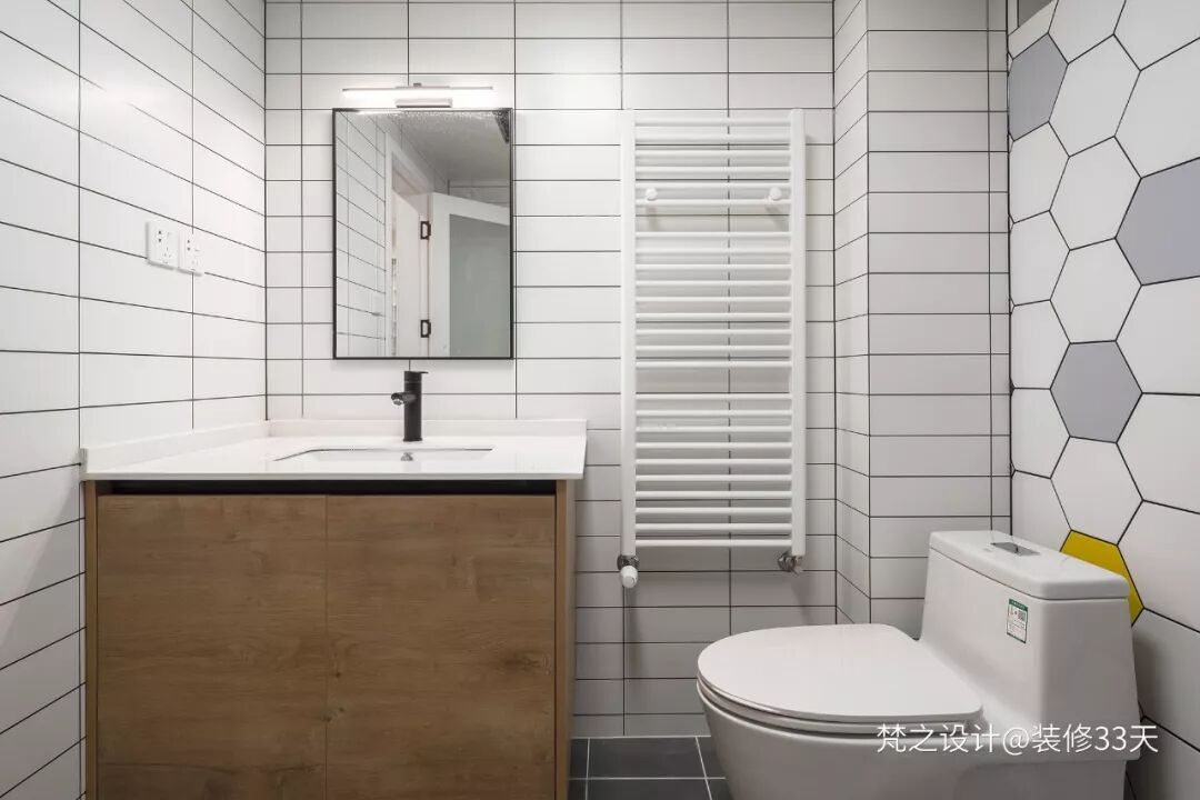 ▲ 卫生间,白色墙砖有序铺贴,暖气片除正常采暖功能,很方便挂毛巾,还可以烘干简单的衣服