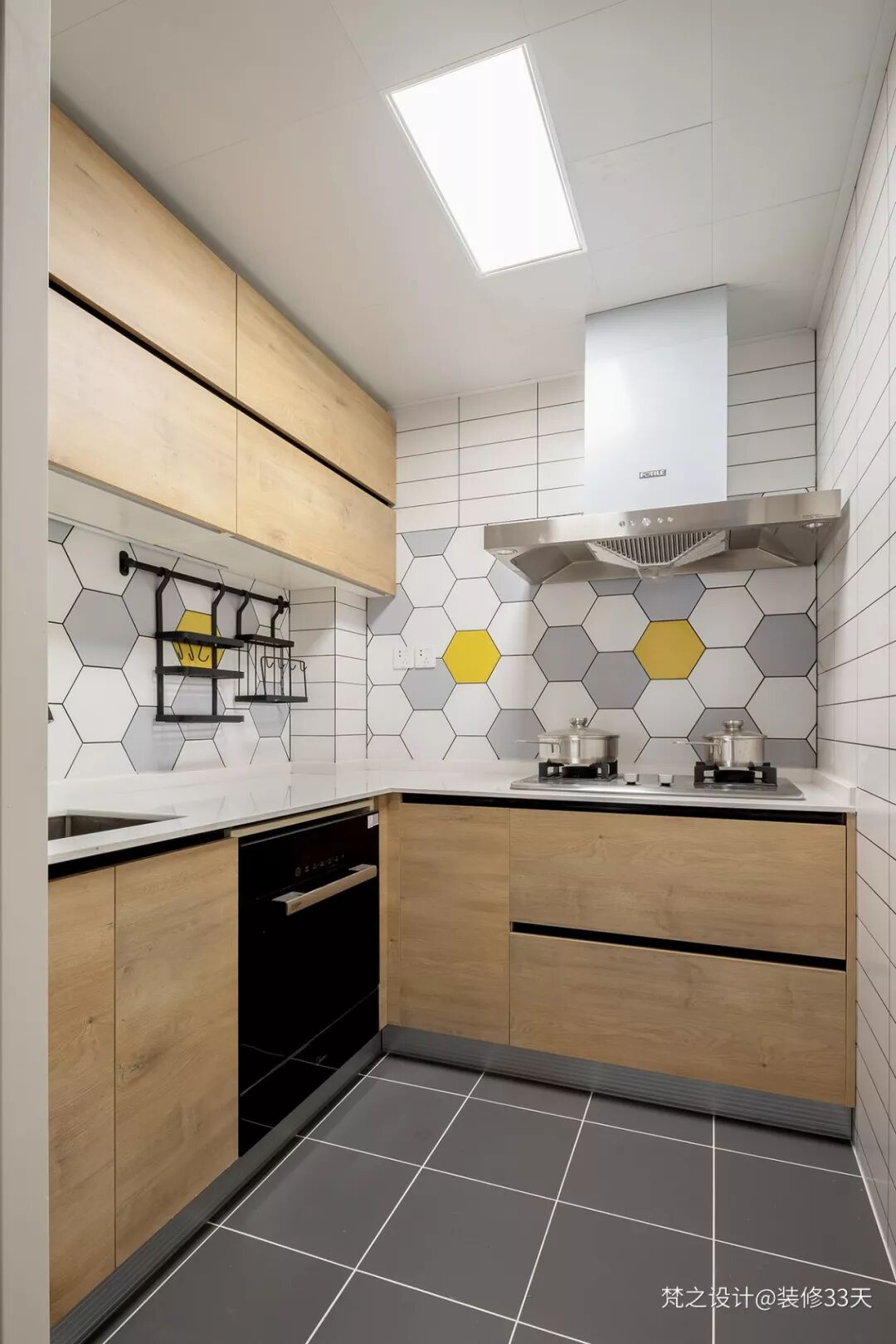 ▲ 厨房,灰色地砖搭配六边形拼色墙砖,零星的黄色提亮色调,厨房虽小,五脏俱全