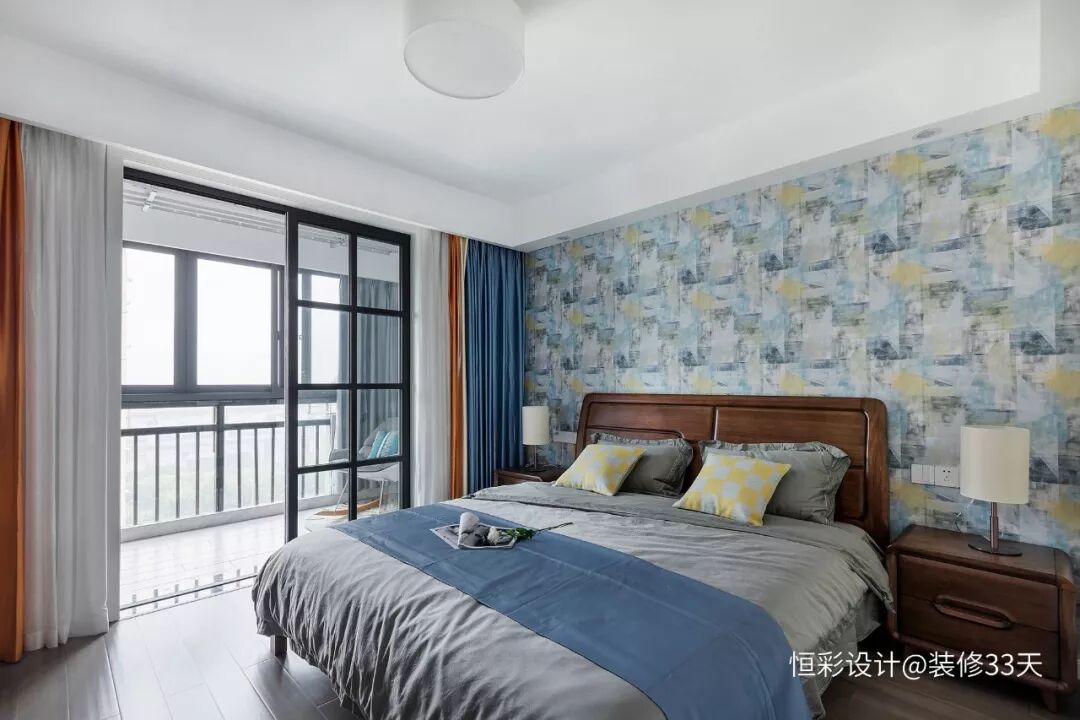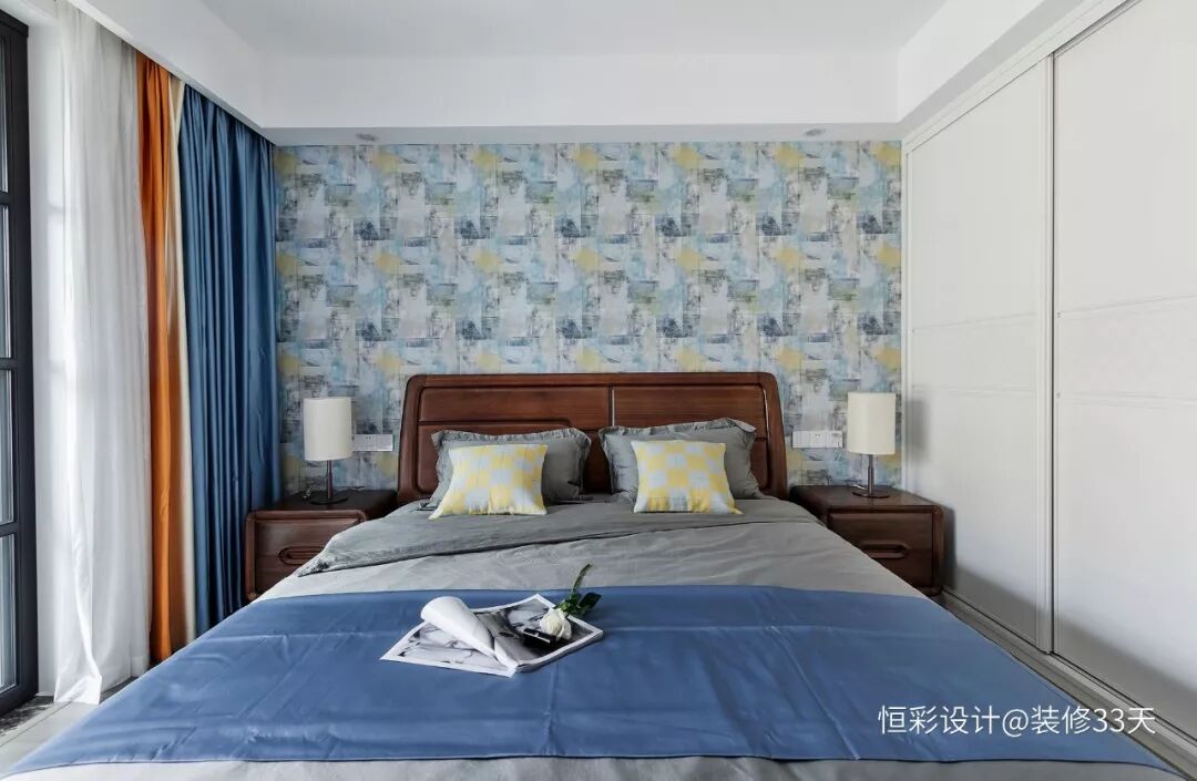 ▲ 背景铺贴蓝色底纹的墙纸,右侧设计移门衣柜负责收纳