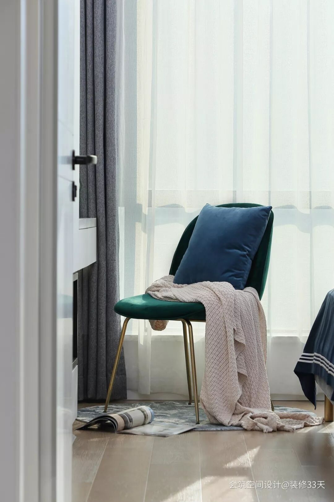 ▲ 主卧延续整体空间的灰白基调,加以黄铜元素和墨绿色系的点缀,营造出一种舒适惬意的感觉