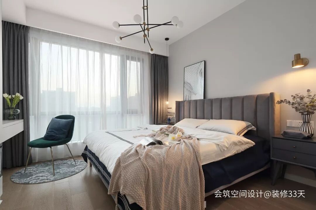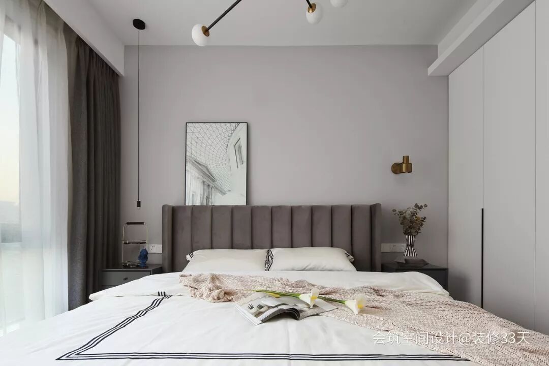 ▲ 浅灰色床背景搭配灰色丝绒软包床,细框艺术画与线性吊灯点缀,床边置顶衣柜满足卧室的收纳需求