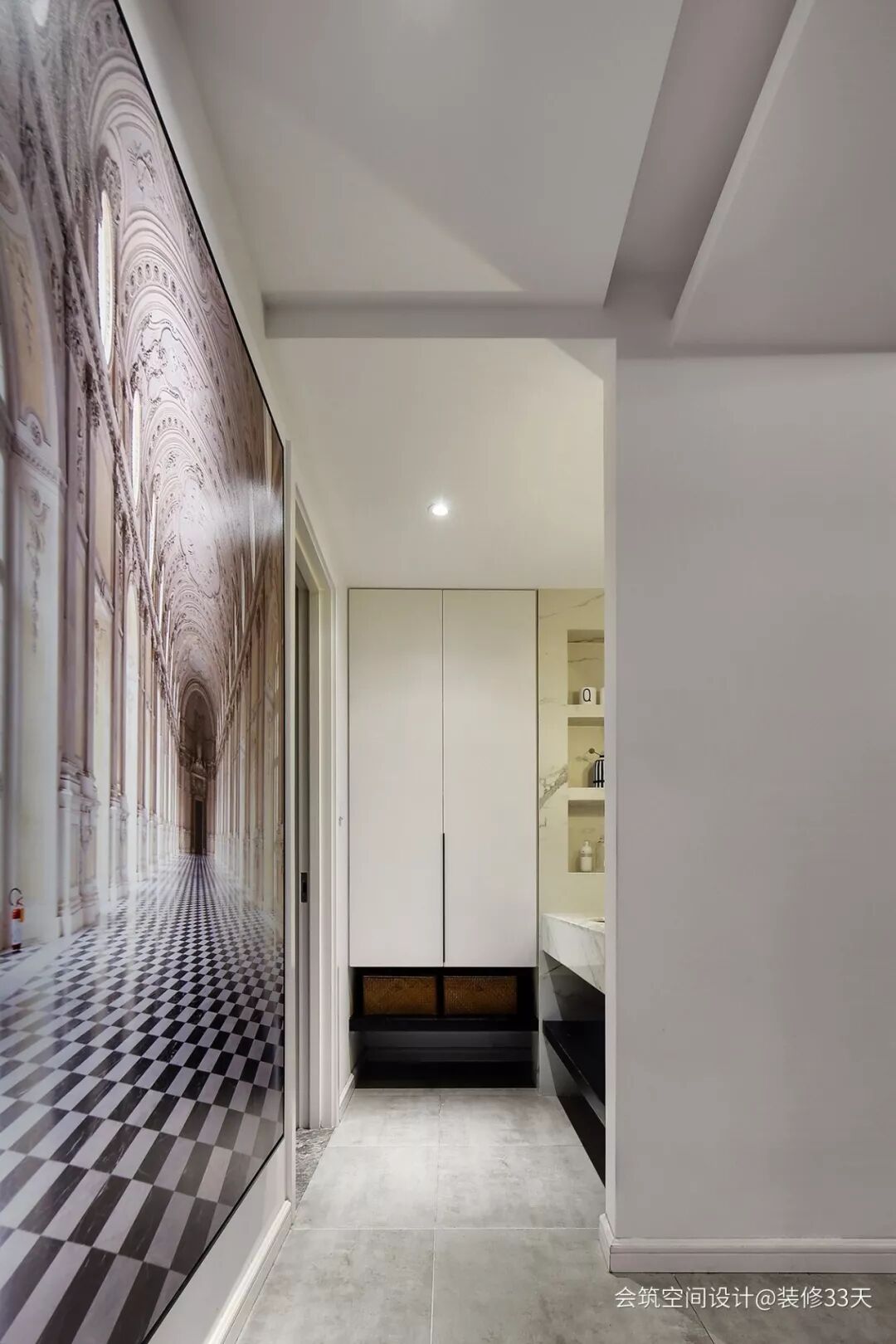 ▲ 以视觉延伸效果的壁画做端景,一旁是卫生间干区,洗手台搭配壁龛与嵌入式储物柜,为小空间提升使用率