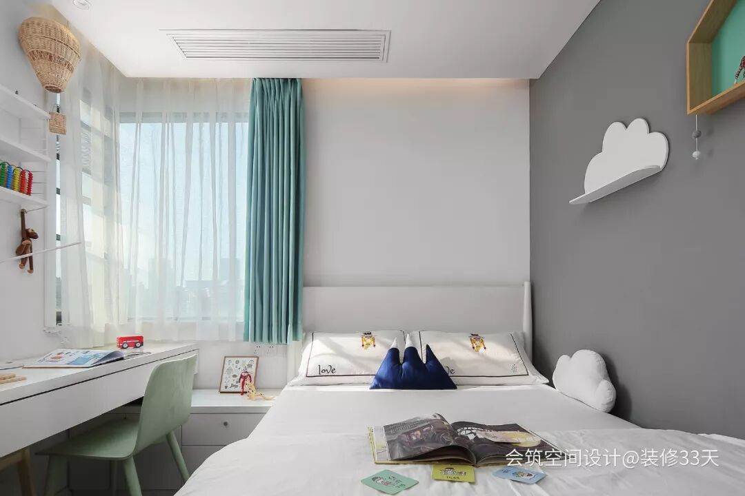 ▲ 儿童房,灰白色的空间基调中搭配 Tiffany 蓝色窗帘,平面图可见一字型的衣柜连体书桌加造型柜的多功能设计,满足储物、学习、睡眠全方位的功能使用