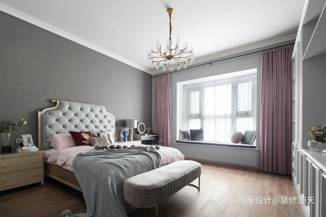 ▲ 主卧,深灰色床背景与其他墙面的浅灰形成对比,卧室一角选购了一款小巧而精致的梳妆台