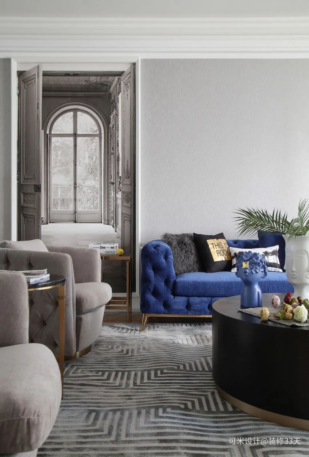 ▲ 蓝色沙发在灰色的映衬下显得格外的亮丽,彰显出摩登与时尚的气质,一幅大气复古的装饰画映入眼帘,乍看以为是一个门,拉伸空间视觉感
