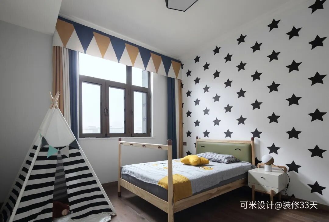 ▲ 小儿房,五星壁纸搭配三角图案的帘缦,清爽又不失童趣,符合孩子身高的家具与小巧的灯具,为孩子创造一个属于他自己的小空间