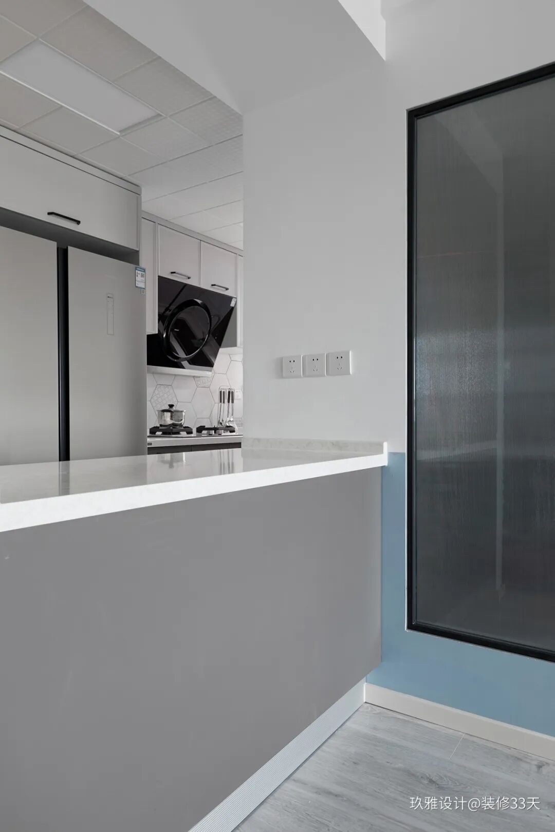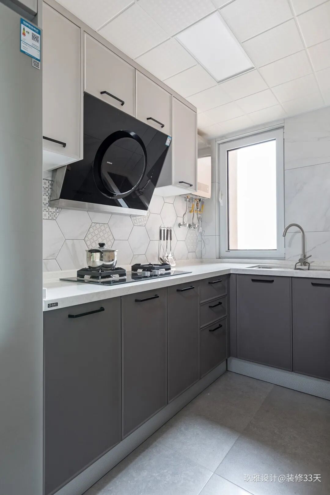 ▲ 厨房,采用六边花砖铺贴背景,男主人使用厨房的时间比较多,而传统厨房的高度是85cm,较适合女性,把橱柜高度调整到90cm,男主准备食材的时候就不用弯腰,减少腰肌劳损