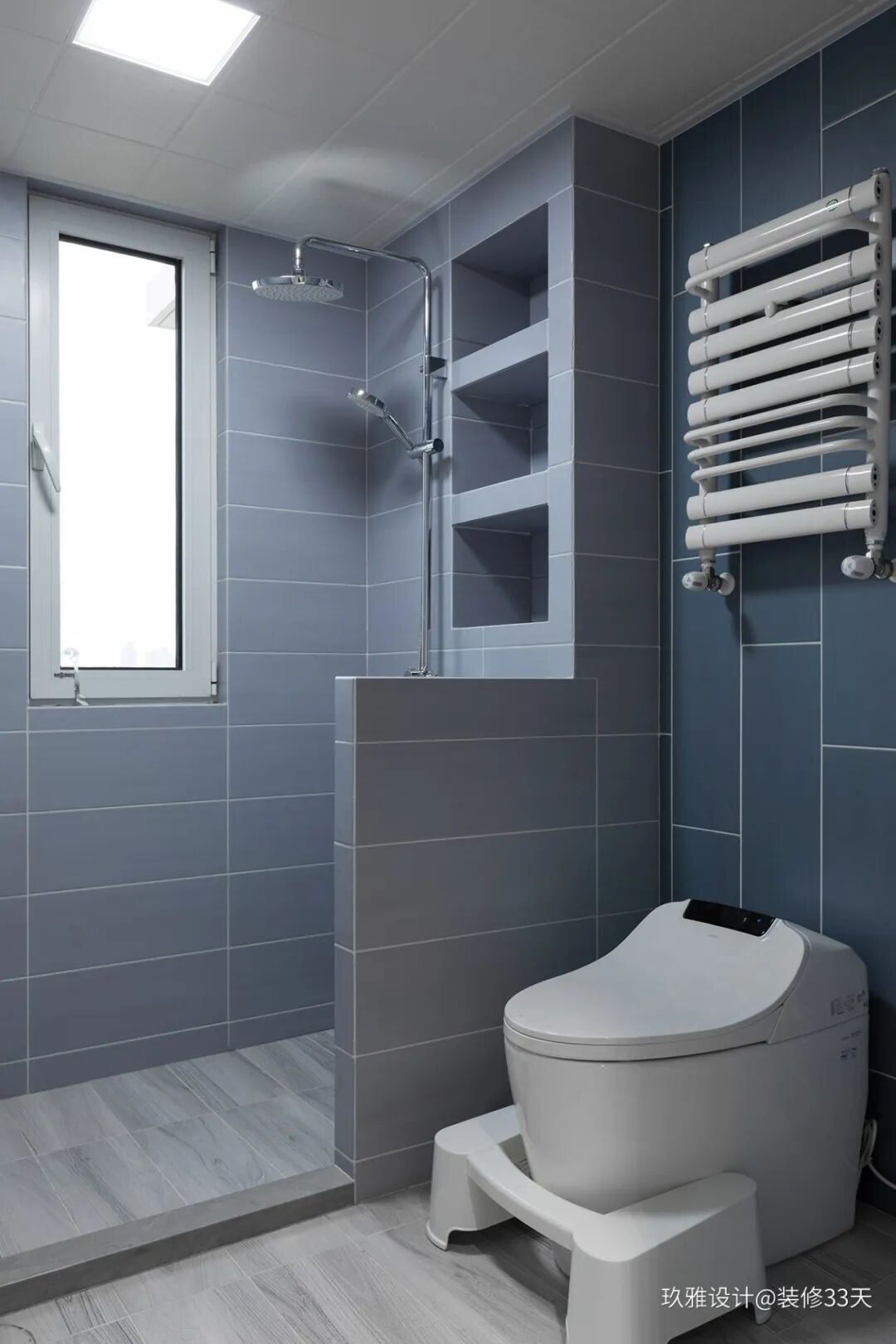 ▲ 灰色基调的主卫,自砌一道半墙作淋浴区隔断,结合三个壁龛用于淋浴区收纳