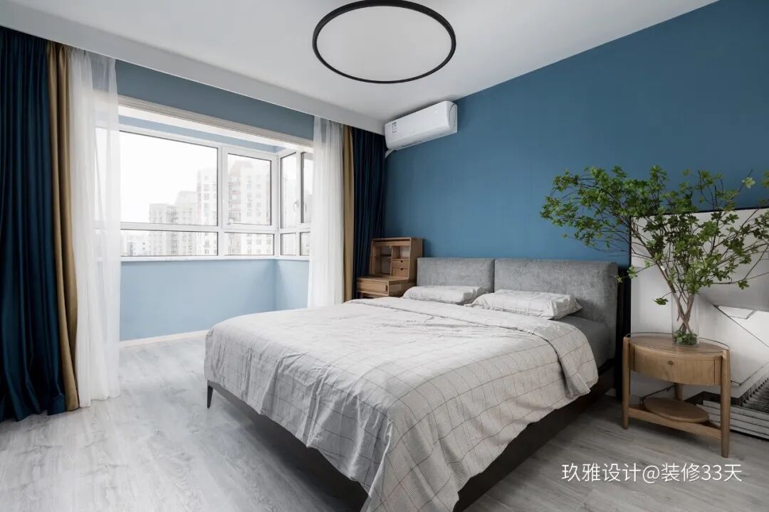▲ 主卧延续浅色木地板,背景墙的蓝色加深一度,与其他墙面形成色彩对比,灰色软包大床搭配原木床头柜与梳妆台