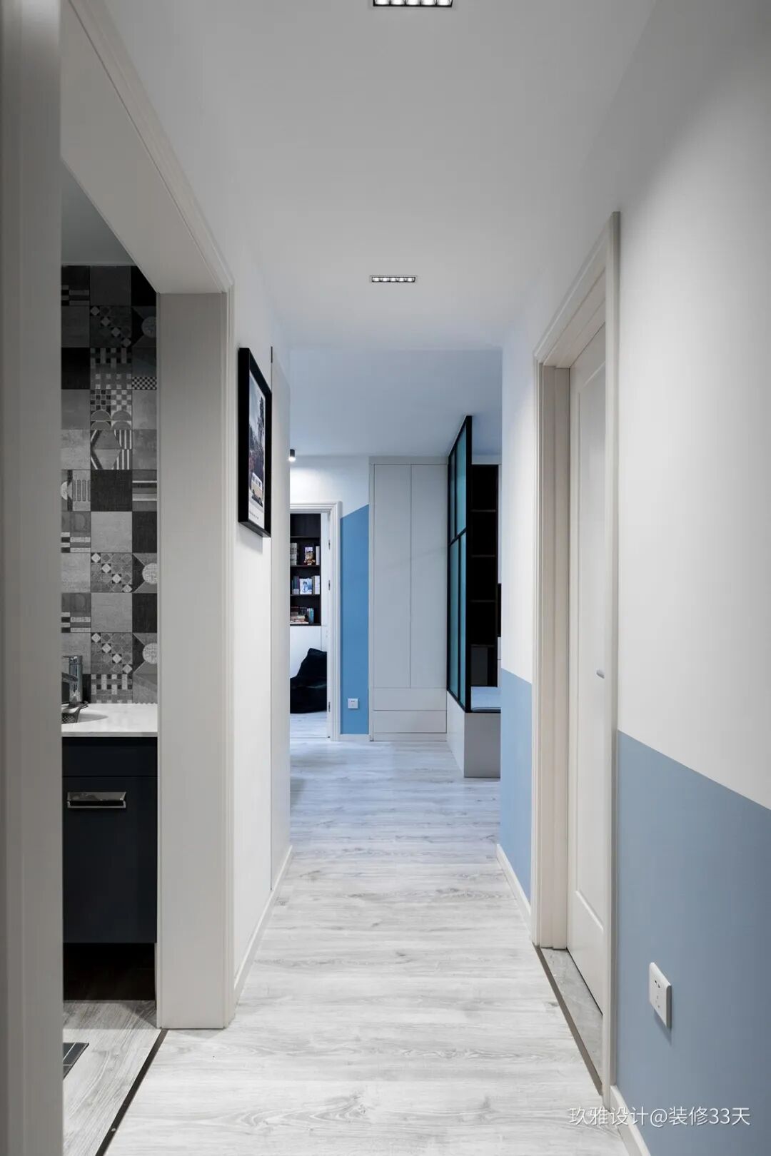 ▲ 在过道的动线上设计分离出来的洗手池,客餐厅的蓝白色调延伸至走廊