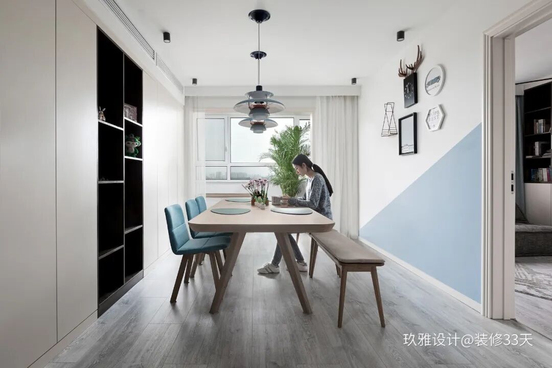 ▲ 将客厅和餐厅融合到一起,以蓝白木为基调,直接舍弃沙发的想法,由一个大大的长条桌作为主角,家庭日常活动都围绕这个长条桌展开