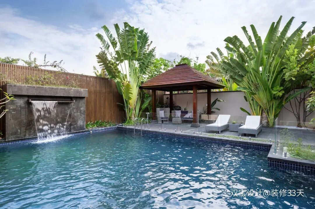 ▲ 在泳池中间加入了流水墙,周边种满了美人蕉,亲近自然