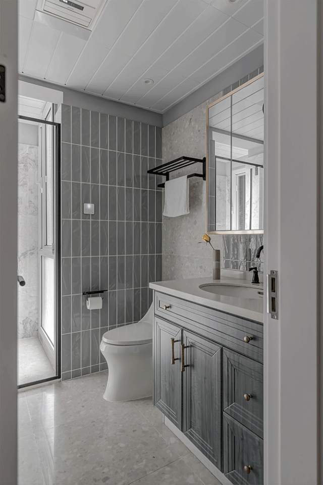▲ 卫生间同样采用灰色调瓷砖铺贴,水磨石瓷砖背景与灰色墙面搭配出低调的气质