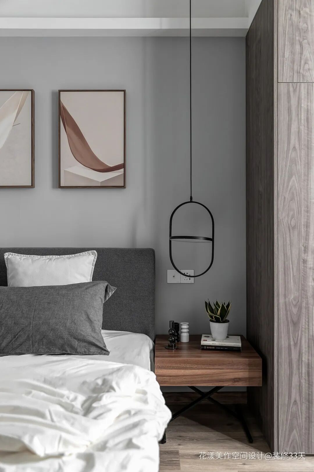 ▲ 主卧整体格调偏沉稳,深色柜体、深灰色的床体和浅灰色的背景搭配白色的墙面,空间呈现一种简洁、利落的清爽感