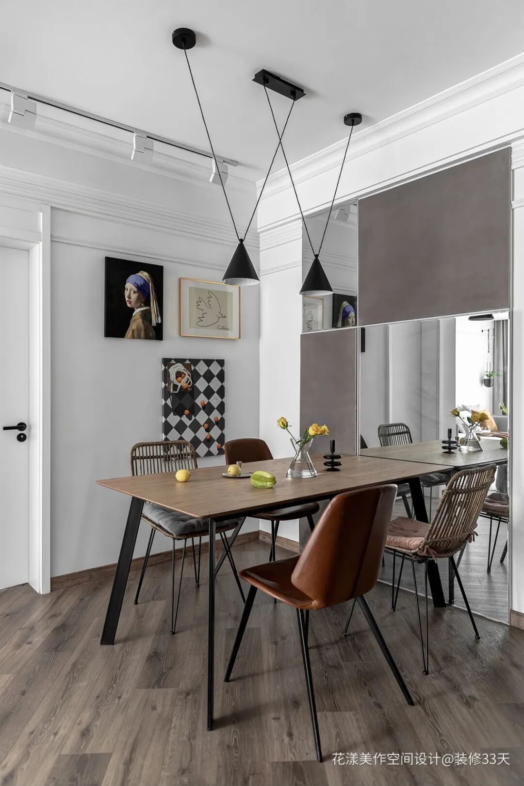 ▲ 餐厅背景的硬包既是装饰作用,又巧妙隐藏强弱电箱,嵌入的十字灯条增加餐厅区域的亮度与装饰性