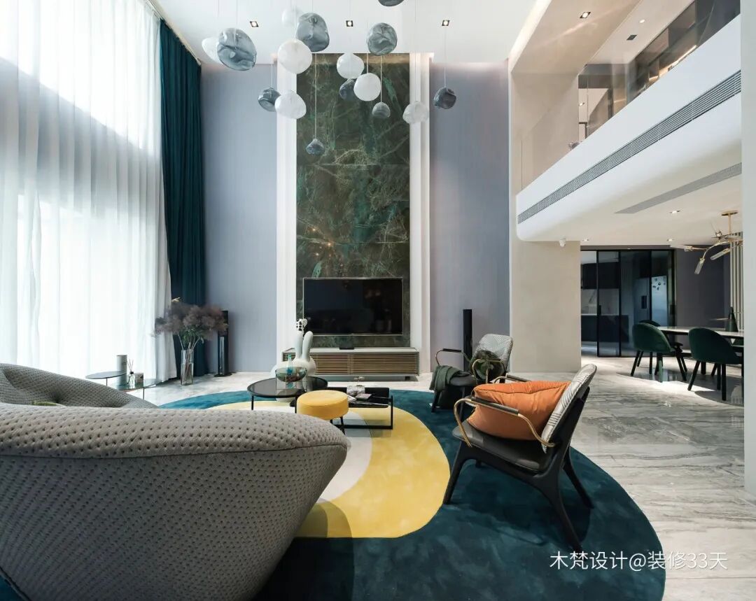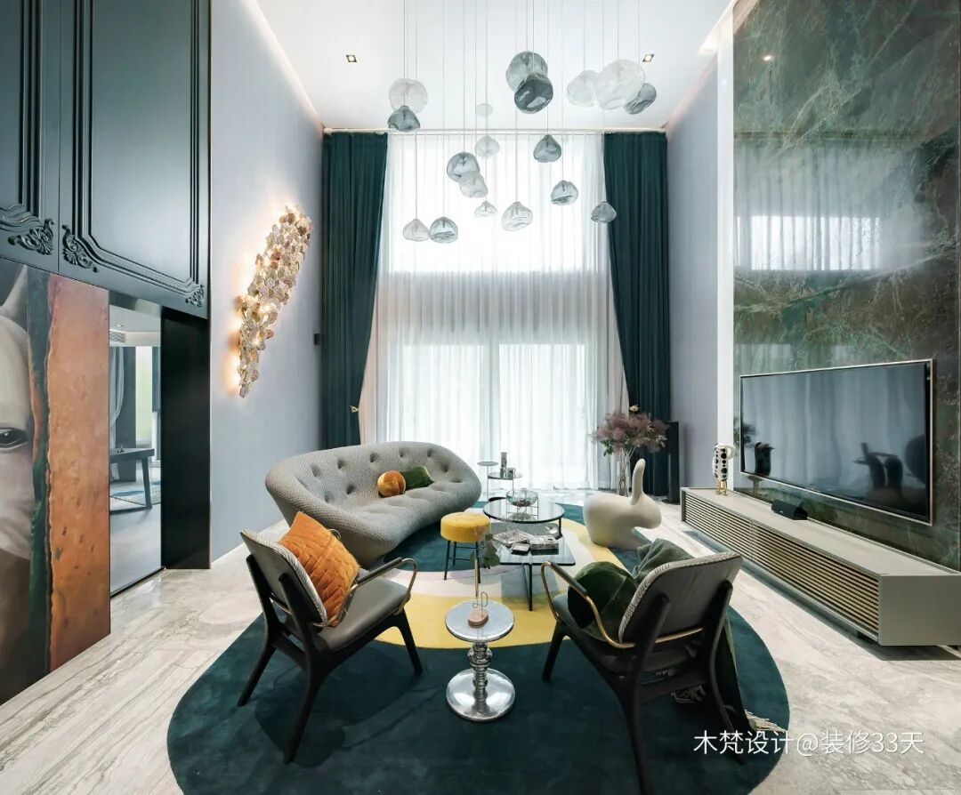 ▲ 电视背景墙特意选择了带有绿纹的大理石石材,搭配绿丝绒窗帘和水滴造型的吊灯,营造出奢华的高级感