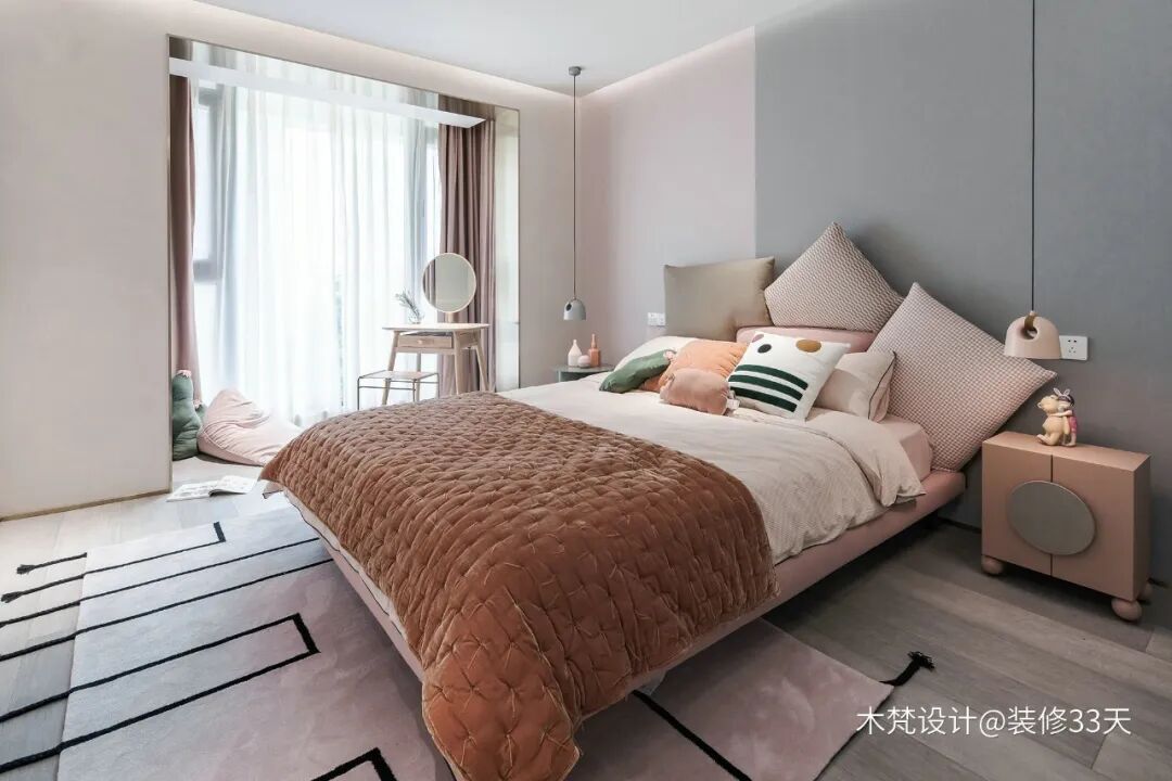 ▲ 女儿房以粉色系为主,拼色背景墙搭配不规则的几何色块床,营造出温暖活泼的氛围