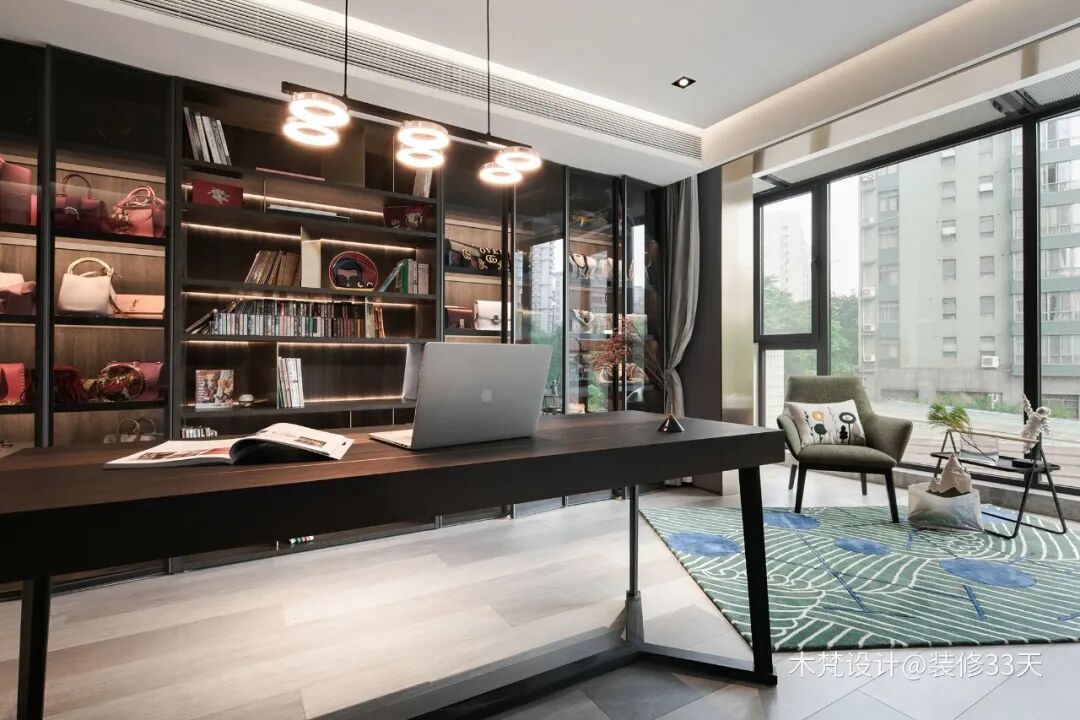 ▲ 书房,整面落地窗赋予空间充足的采光,背景打造大面积柜体,中间部分用于摆放男主人的一些收藏,其余空间已然成为女主人的『藏宝阁』