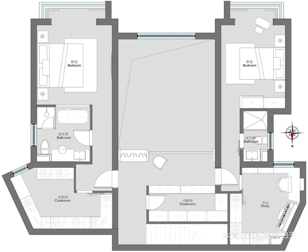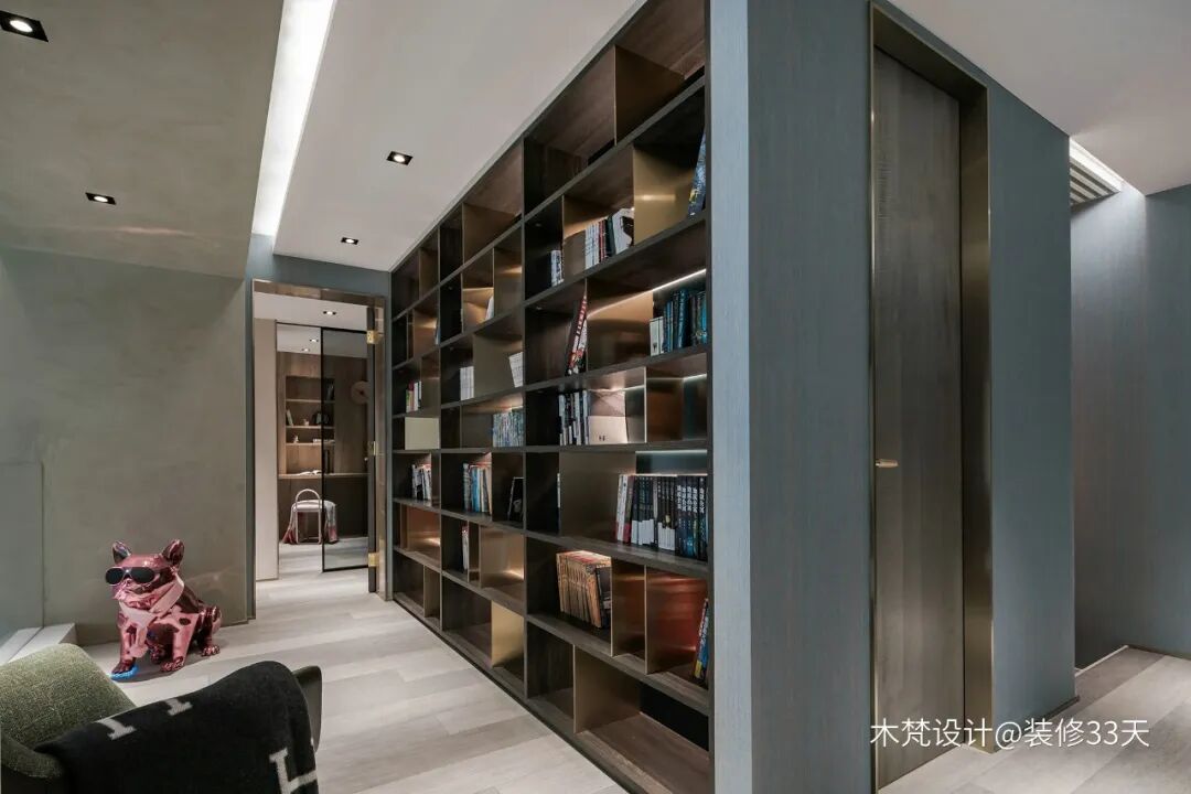 ▲ 走廊设计了整面大书柜,摆满了业主的藏书,背面是男主衣帽间