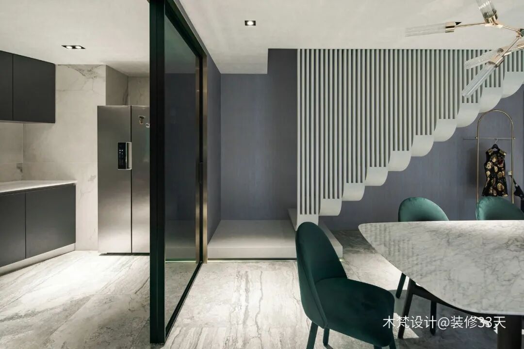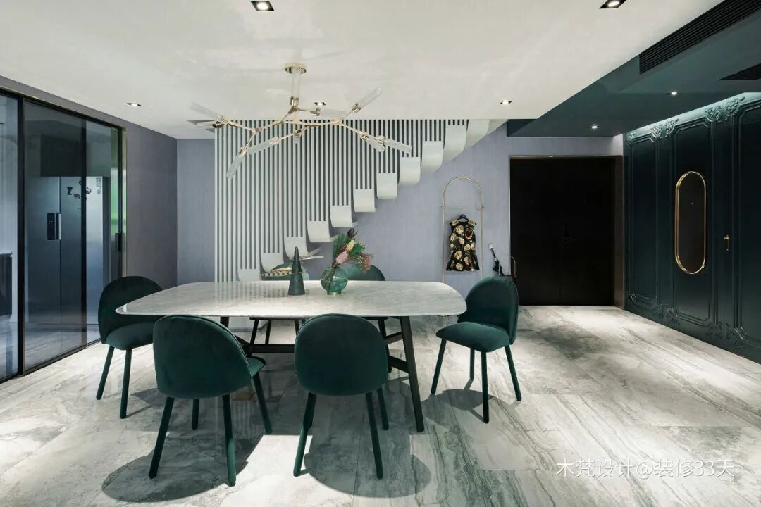 ▲ 入户即为餐厅区域,大理石餐桌结合墨绿色餐椅凸显高级感,餐桌台面与地面同色调