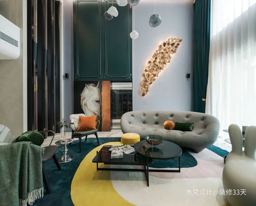 ▲ 定制羊毛地毯将整个客厅的色彩重心集中,Ligner roset 的灰色弧形沙发舒适而时尚,墙面的造型壁灯将金属元素完美融合体现