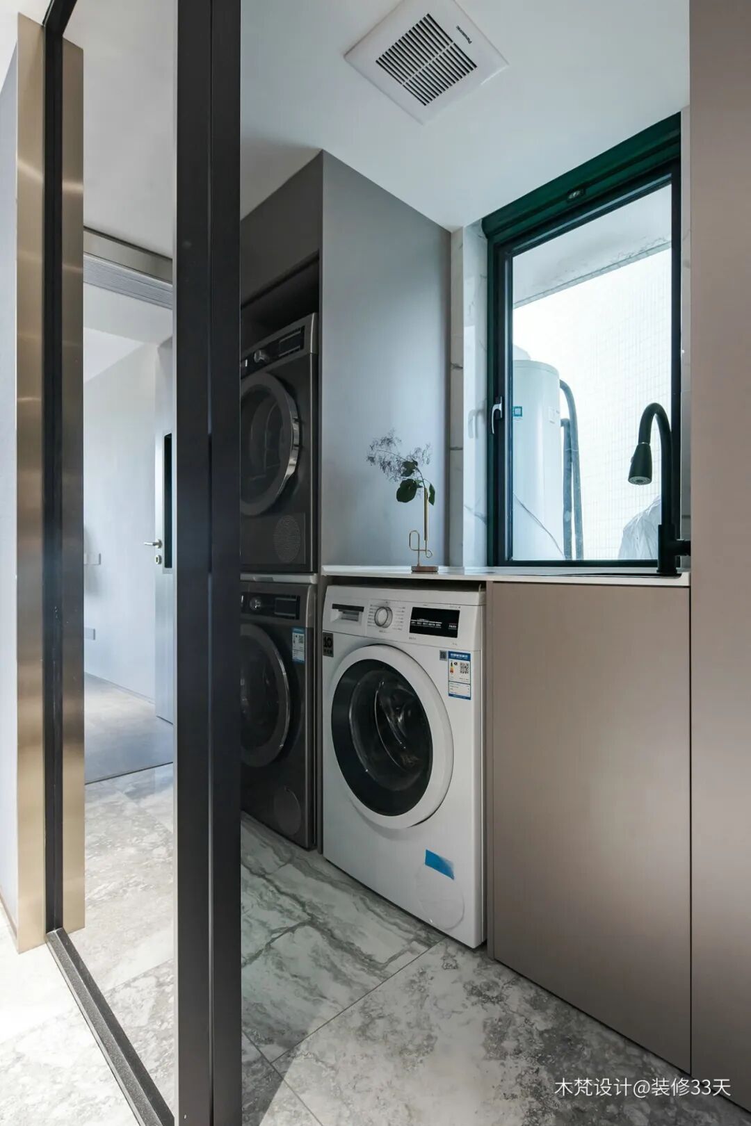 ▲ 洗衣区,定制U型柜体纳入洗衣机与干衣机,柜体部分可用于储备洗衣用品