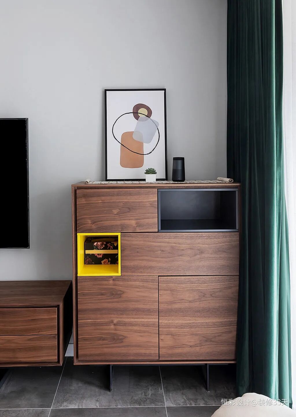 ▲ 客厅,灰色哑光地砖搭配灰色地毯,墨绿色窗帘与金色灯饰提升空间质感
